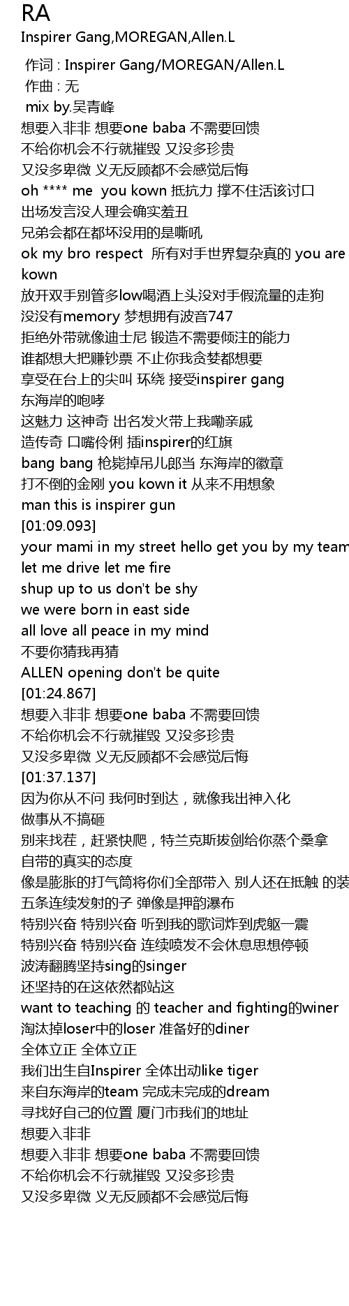 | [00:00.000] | zuo ci : Inspirer Gang MOREGAN Allen. L |