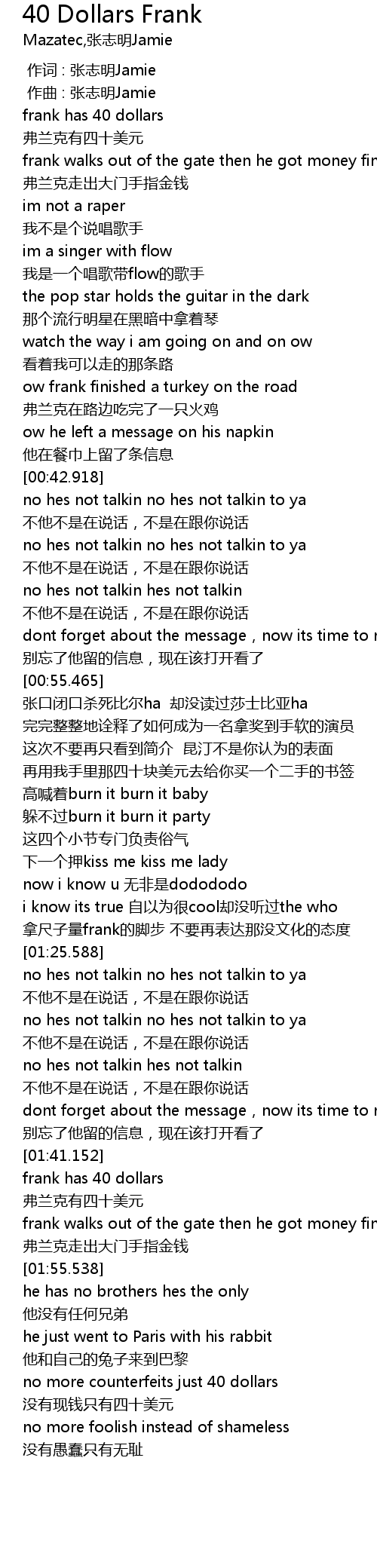 | [01:42.658] | 弗兰克有四十美元 |