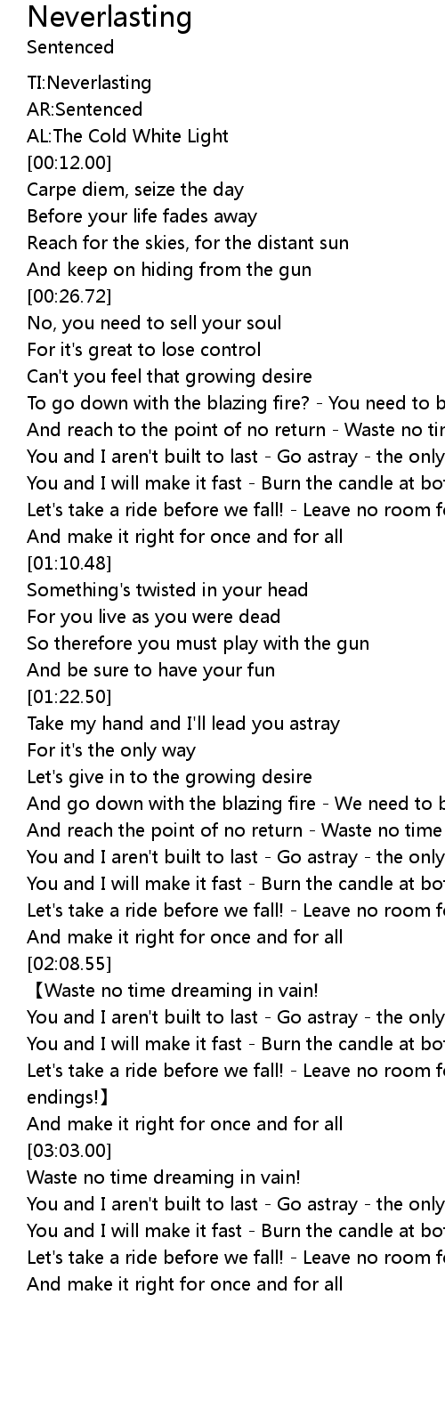 | [02:48.34] | You and I will make it fast Burn the candle at both ends! |