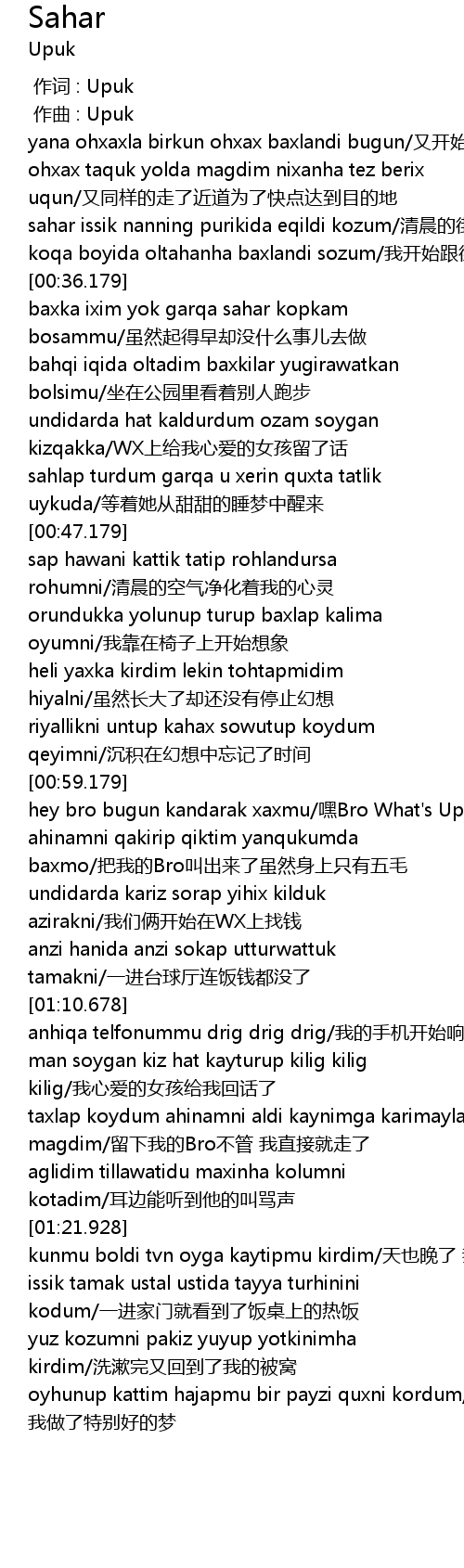 | [00:45.679] | sahlap turdum garqa u xerin quxta tatlik uykuda/等着她从甜甜的睡梦中醒来 |