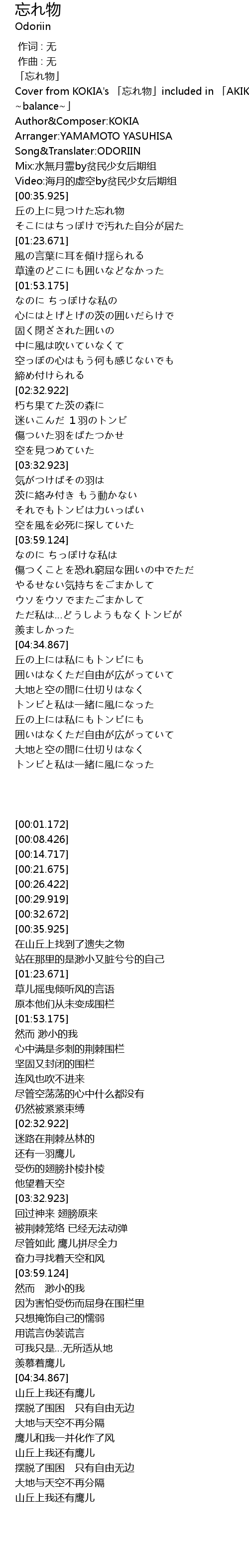 | [00:08.426] | Cover from KOKIA's 「忘れ物」included in 「AKIKO∞KOKIA ~balance~」 |