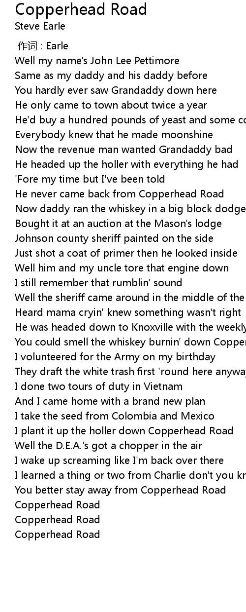 | [02:27.62] | You could smell the whiskey burnin' down Copperhead Road |