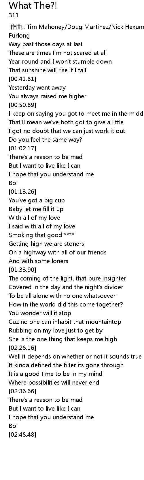 | [00:00.000] | zuò qǔ : Tim Mahoney Doug Martinez Nick Hexum Aaron Wills Nicholas Furlong |