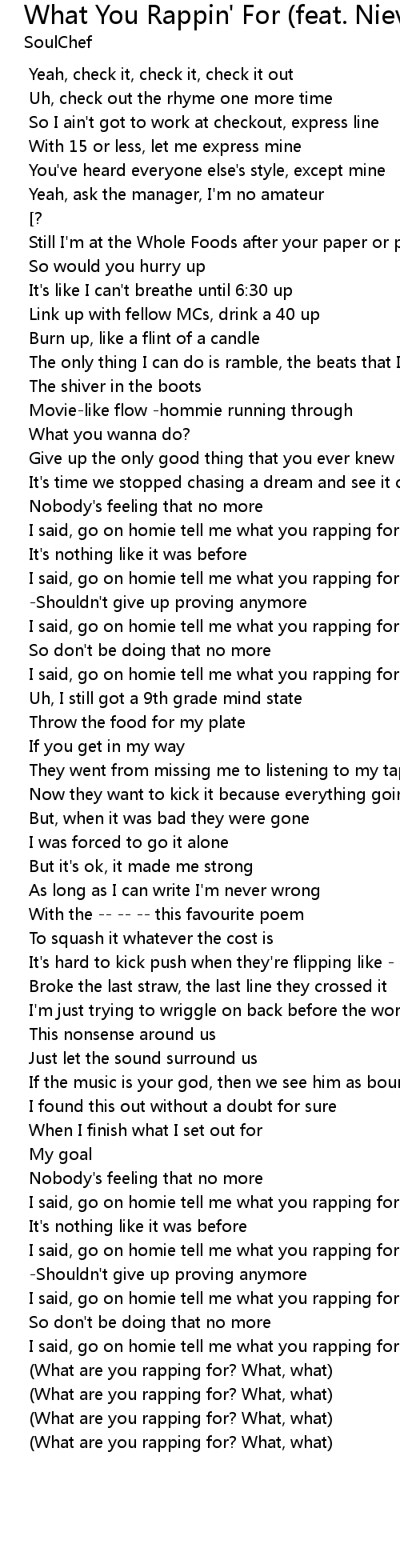 | [01:21.261] | I said, go on homie tell me what you rapping for? |