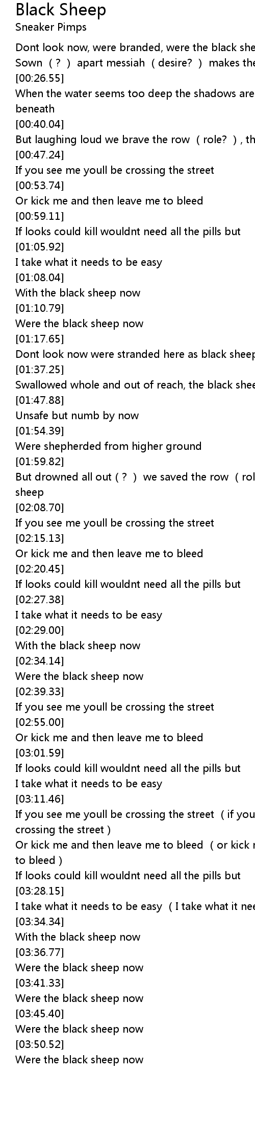 | [01:32.71] | Dont look now were stranded here as black sheep |