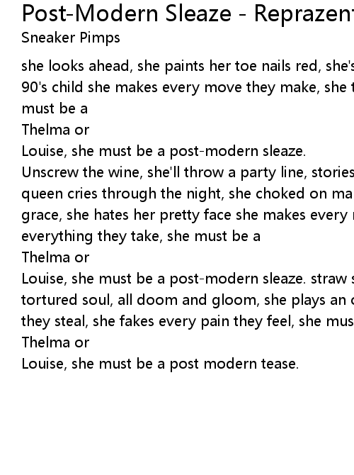 Louise, she must be a post-modern sleaze. straw spun from gold, she craves a tortured soul, all doom and gloom, she plays an open wound, she takes everything they steal, she fakes every pain they feel, she must be a |