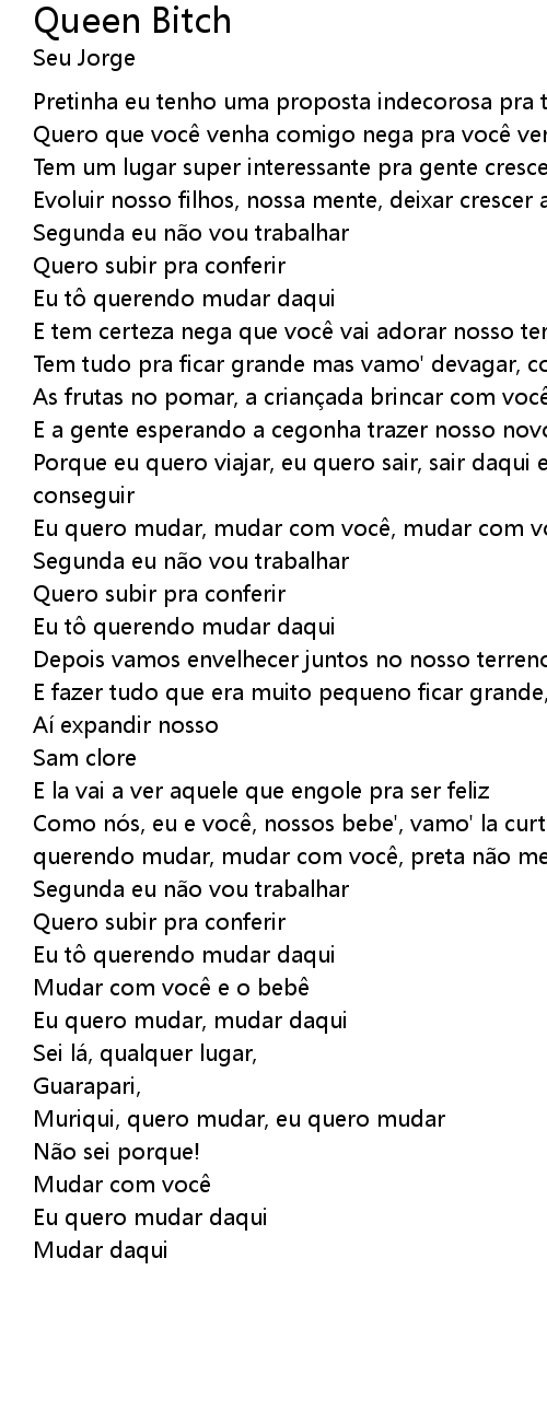 | Como no s, eu e voc, nossos bebe', vamo' la curtir, vamo' sair daqui, eu to querendo mudar, mudar com voc, preta n o me deixe, eu t querendo sair | |