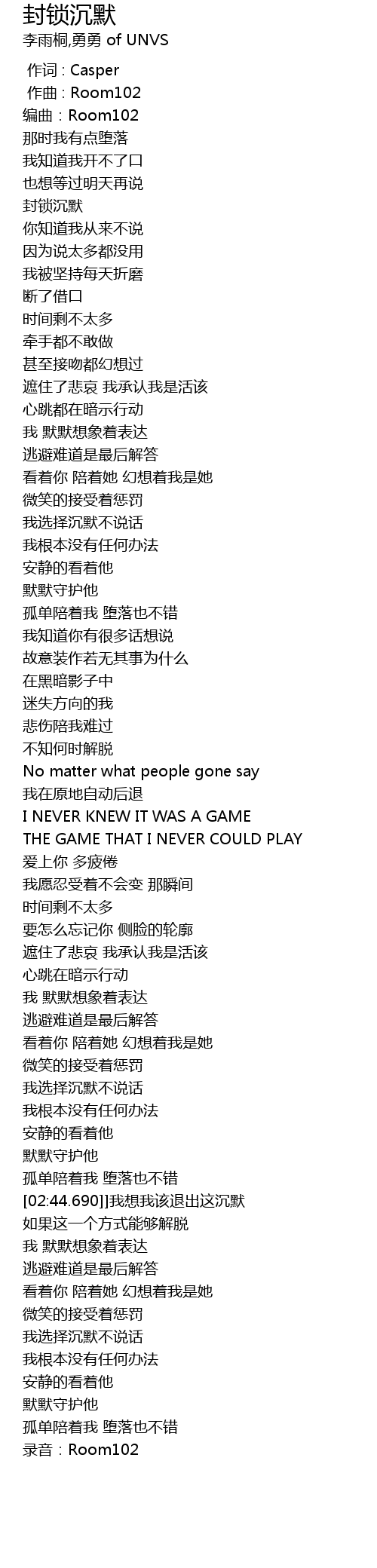 | [01:14.438] | wǒ xuǎn zé chén mò bù shuō huà |