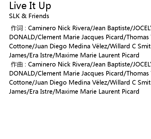 | [00:00.00-1] | 作词 : Caminero Nick Rivera/Jean Baptiste/JOCELYN ADRIENE DONALD/Clement Marie Jacques Picard/Thomas Wesley Pentz/Maegan Severia Cottone/Juan Diego Medina Vélez/Willard C Smith/Quavious Keyate Marshall/Marty James/Era Istre/Maxime Marie Laurent Picard |