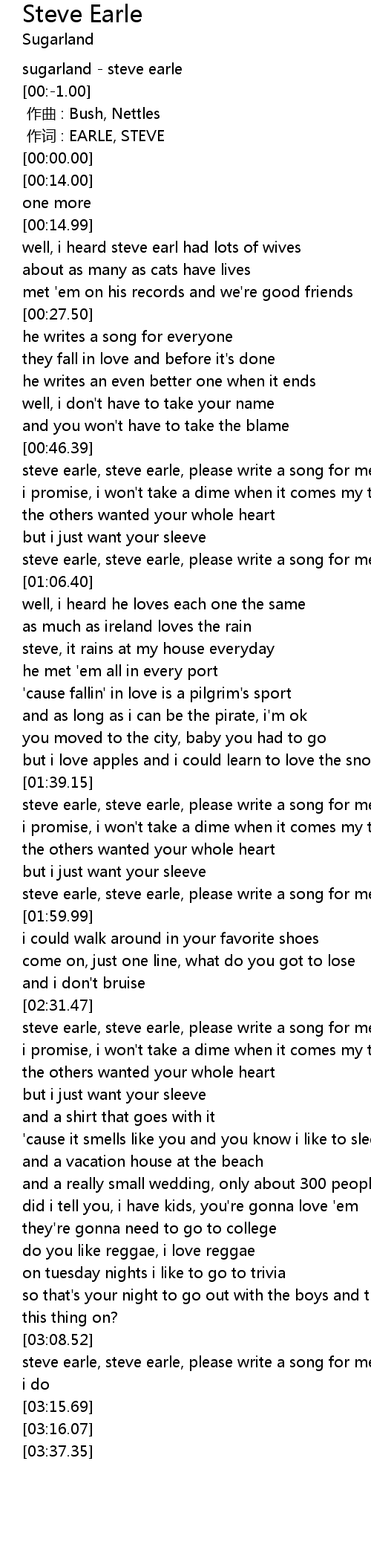 | [02:32.81] | steve earle, steve earle, please write a song for me |