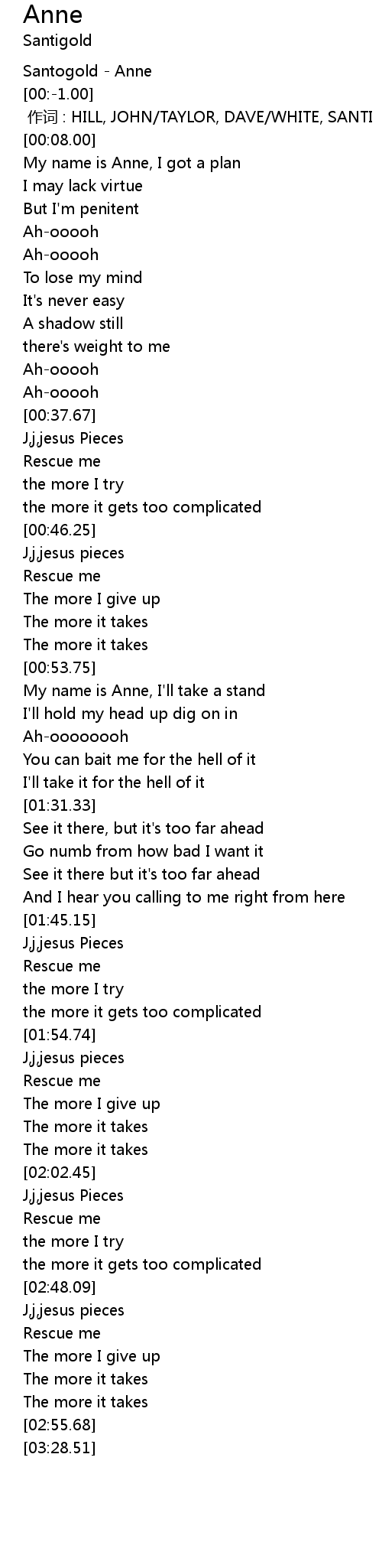 | [00:00.00] | 作词 : HILL, JOHN/TAYLOR, DAVE/WHITE, SANTI |