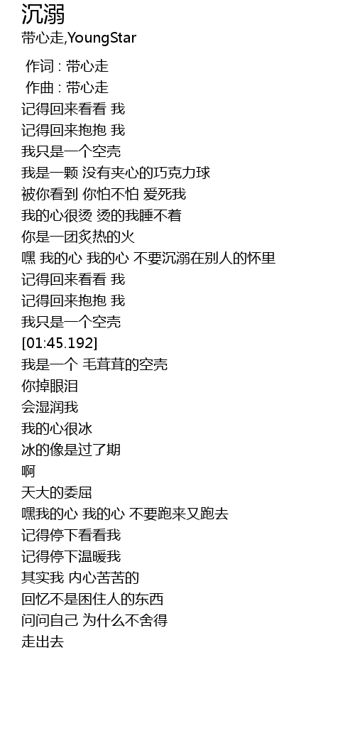 | [01:04.690] | 嘿 我的心 我的心 不要沉溺在别人的怀里 |