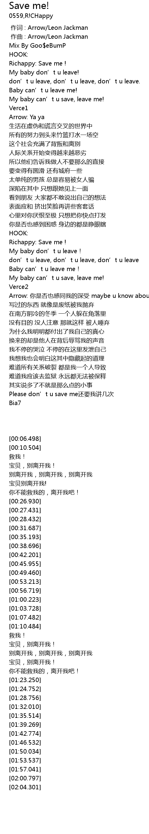 | [02:04.301] | Please don' t u save me hái yào wǒ jiǎng jǐ cì |