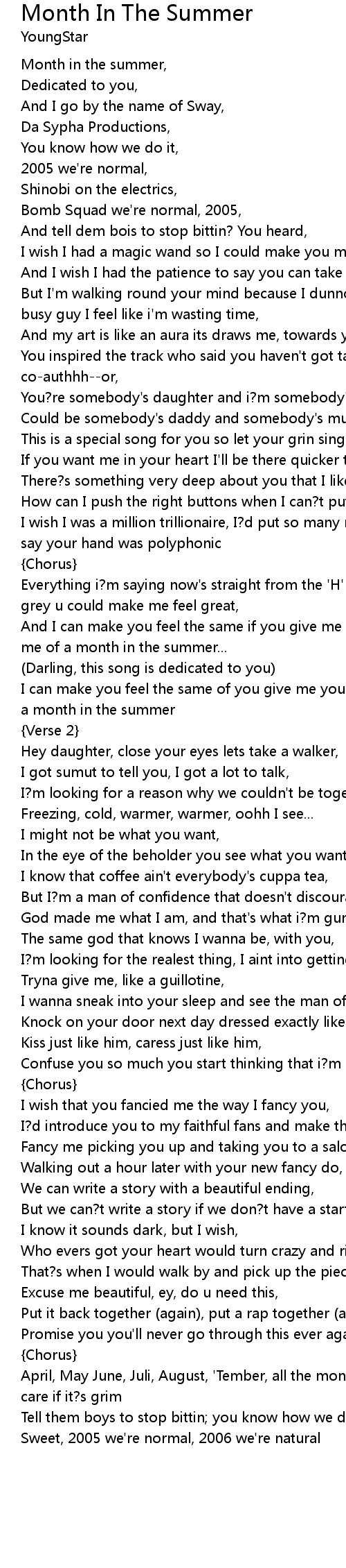 April, May June, Juli, August, 'Tember, all the months in the summer, I don?t care if it?s grim |