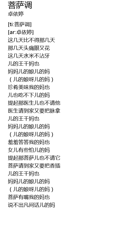| [01:08.179] | 妈妈儿的娘儿的妈 |