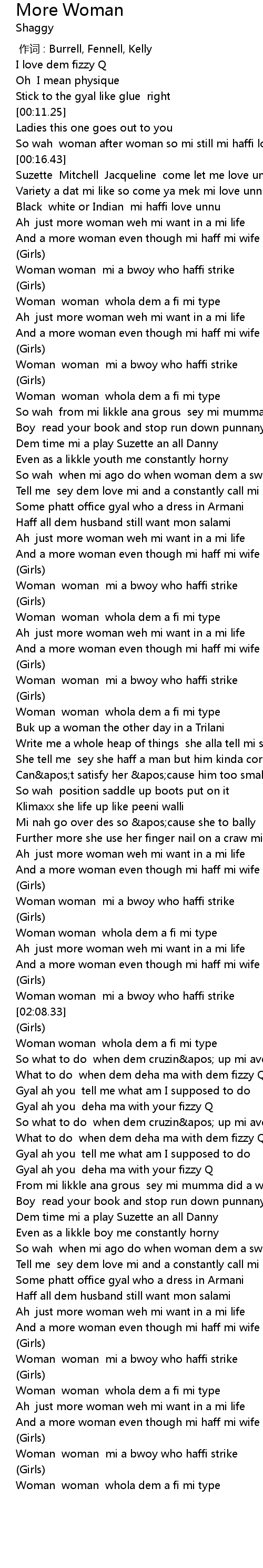 | [02:56.69] | And a more woman even though mi haff mi wife |