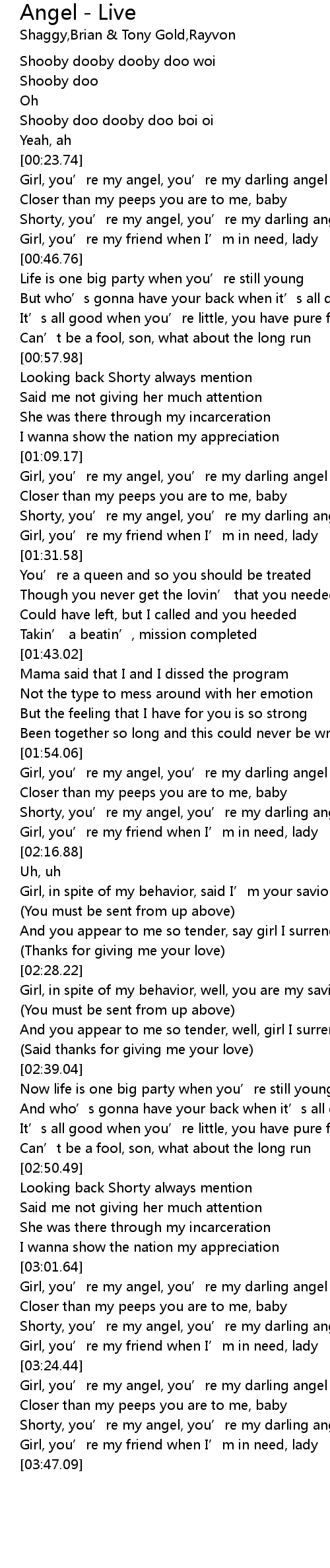 | [03:13.46] | Shorty, you’re my angel, you’re my darling angel |