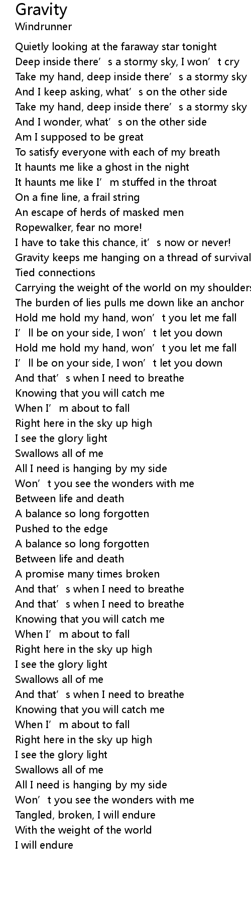| [01:30.69] | Gravity keeps me hanging on a thread of survival |