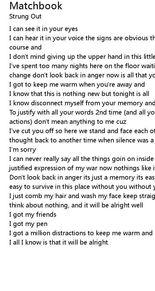 I've spent too many nights here on the floor waiting for something inside you to change don't look back in anger now is all that you can say cuz angers all