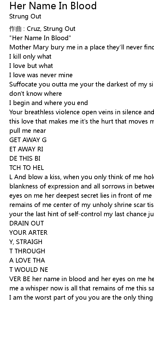 | L And blow a kiss, when you only think of me hold my hand and **** away this blankness of expression and all sorrows in between her name in blood and her eyes on me her deepest secret lies in front of me a whisper now is all that remains of me center of my unholy shrine scar tissue in time you're all mine your the last hint of self-control my last chance just walked out the door | |