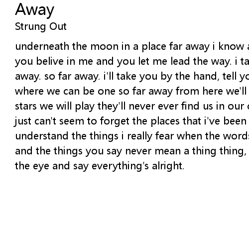 underneath the moon in a place far away i know a place where we can run away. if you belive in me and you let me lead the way. i take your pain, i'll wish it all away. so far away. i'll take you by the hand, tell you never to fear in a world where we can be one so far away from here we'll kiss the sky together amoung the stars we will play they'll never ever find us in our castle, so far away well i just can't seem to forget the places that i've been why don't you help me understand the things i really fear when the words, they never come out right and the things you say never mean a thing thing, when you look me straight in the eye and say everything's alright. |