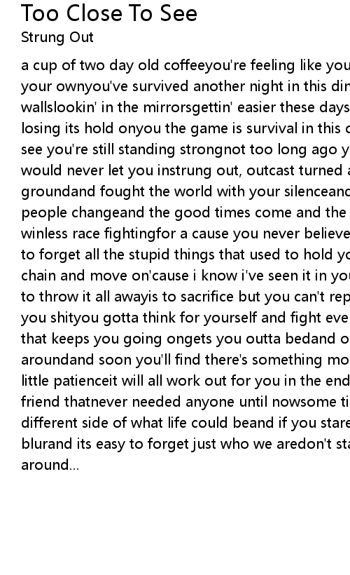 a cup of two day old coffeeyou're feeling like yourself againyou're still on your ownyou've survived another night in this dingy room with the same four wallslookin' in the mirrorsgettin' easier these daysthat old friend anger is losing its hold onyou the game is survival in this crazy worldand it's good to see you're still standing strongnot too long ago you were tearing at a worldthat would never let you instrung out, outcast turned awayyou kept your face to the groundand fought the world with your silenceand so the seasons change and the people changeand the good times come and the good times gofound yourself in a winless race fightingfor a cause you never believedits easy to regretnot so easy to forget all the stupid things that used to hold you downyou gotta brake that chain and move on'cause i know i've seen it in your eyes beforeto surrender now to throw it all awayis to sacrifice but you can't repayin a world that don't owe you shityou gotta think for yourself and fight every bit of that piece of mind that keeps you going ongets you outta bedand out that doorstep back take a look aroundand soon you'll find there's something morethat'll come your way with a little patienceit will all work out for you in the endthis is my song to a friend thatnever needed anyone until nowsome times you get too close to seea different side of what life could beand if you stare too long it all becomes a blurand its easy to forget just who we aredon't stare to hard, just take a look around... |