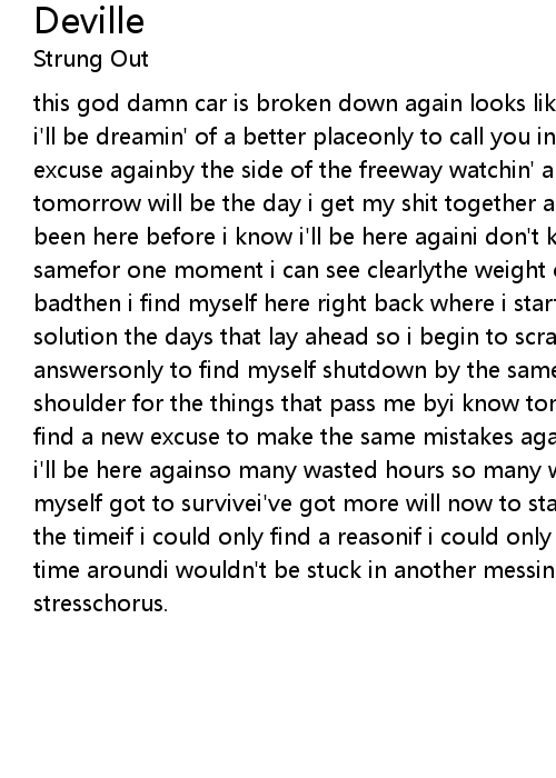 this god damn car is broken down again looks like i'm sleepin' in the back and i'll be dreamin' of a better placeonly to call you in the morning with the same excuse againby the side of the freeway watchin' all the cars go byi think tomorrow will be the day i get my shit together and give up this crying gamei've been here before i know i'll be here againi don't know why but it don't feel the samefor one moment i can see clearlythe weight of the world don't seem so badthen i find myself here right back where i started from againindecisions's no solution the days that lay ahead so i begin to scramble in my head for the answersonly to find myself shutdown by the same mistakes againlookin over my shoulder for the things that pass me byi know tomorrow will be the same i'll find a new excuse to make the same mistakes againi've been here before i know i'll be here againso many wasted hours so many wasted intentionschorus.i beat myself got to survivei've got more will now to stay aliveif i could only find the timeif i could only find a reasonif i could only run this last leg first time aroundi wouldn't be stuck in another messin another realm with the same old stresschorus. |