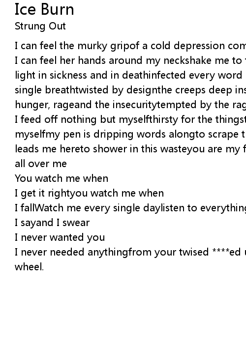 I can feel her hands around my neckshake me to the groundice burn of the soulin light in sickness and in deathinfected every word and every thoughtand every single breathtwisted by designthe creeps deep inside of mefeedin off this hunger, rageand the insecuritytempted by the rage |