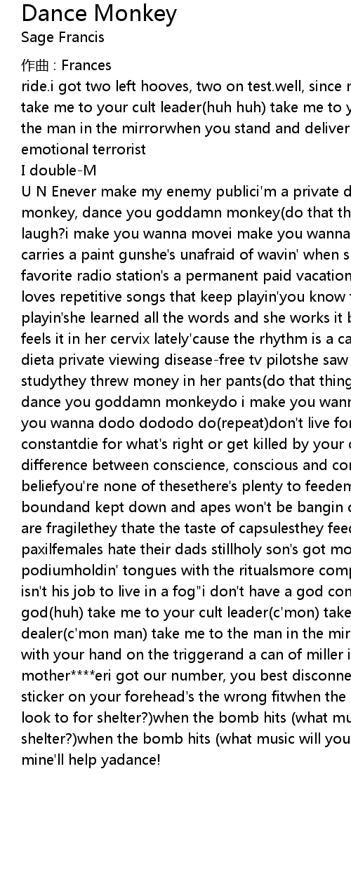 | U N Enever make my enemy publici' m a private dancer, dancin' for moneydance monkey, dance you goddamn monkey do that thing that' s funny do i make you wanna laugh? i make you wanna movei make you wanna dodo dododo do repeat case one carries a paint gunshe' s unafraid of wavin' when she' s gettin' her face doneher favorite radio station' s a permanent paid vacationburnin' her face in the sunshe loves repetitive songs that keep playin' you know the repetitive songs that keep playin' she learned all the words and she works it babydangerously catchy and she feels it in her cervix lately' cause the rhythm is a cancershe' s on a secret dieta private viewing diseasefree tv pilotshe saw the future in a group studythey threw money in her pants do that thing that' s funny dance monkey, dance you goddamn monkeydo i make you wanna laugh? i make you wanna movei make you wanna dodo dododo do repeat don' t live for the moment live for the constantdie for what' s right or get killed by your consciencethere' s a difference between conscience, conscious and conscientiouscontrary to popular beliefyou' re none of thesethere' s plenty to feedempty mouths' ve been nest boundand kept down and apes won' t be bangin on the chest poundwhen pacemakers are fragilethey thate the taste of capsulesthey feed their face with paxilfemales hate their dads stillholy son' s got mommy issues on deck at the podiumholdin' tongues with the ritualsmore complex than napoleoni told' em" it isn' t his job to live in a fog" i don' t have a god complex, you' ve got a simple god huh take me to your cult leader c' mon take me to your local drug dealer c' mon man take me to the man in the mirrorwhen you stand and deliver with your hand on the triggerand a can of miller in the otheryou can' t kill me mother eri got our number, you best disconnect before i call itthe bumper sticker on your forehead' s the wrong fitwhen the bomb hits what music will you look to for shelter? when the bomb hits what music will you look to for shelter? when the bomb hits what music will you look to for shelter? not that mine' ll help yadance! |