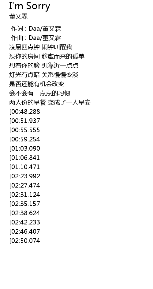 | [03:08.391][02:23.992][01:17.577] | I’m sorry 无论你现在何处 |