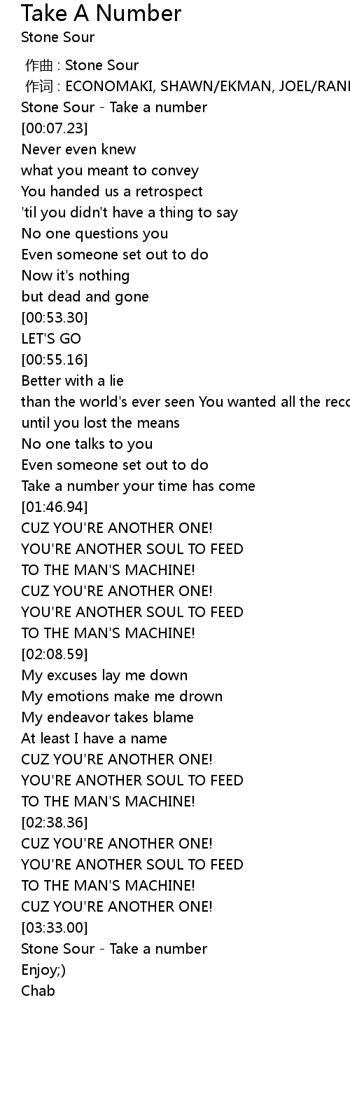 | [01:53.44] | YOU'RE ANOTHER SOUL TO FEED |
