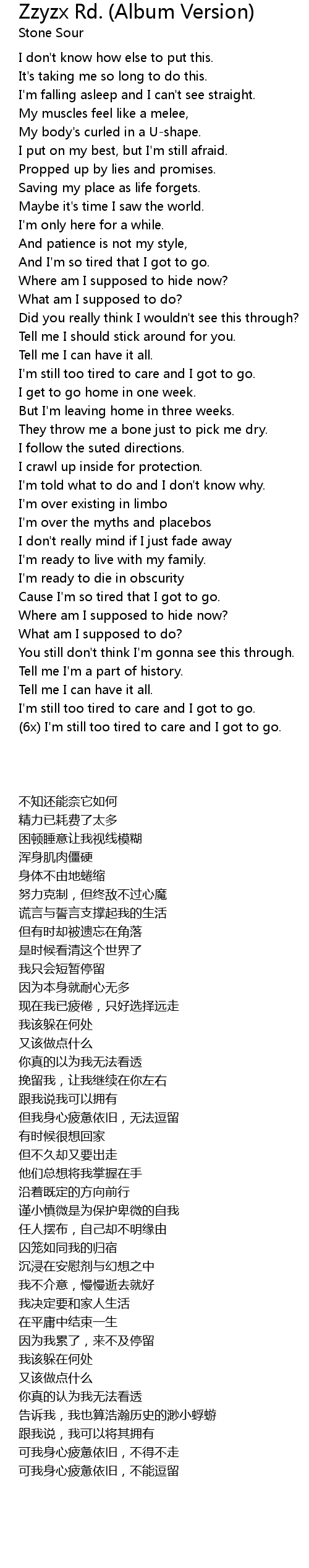 (6x) I'm still too tired to care and I got to go. |