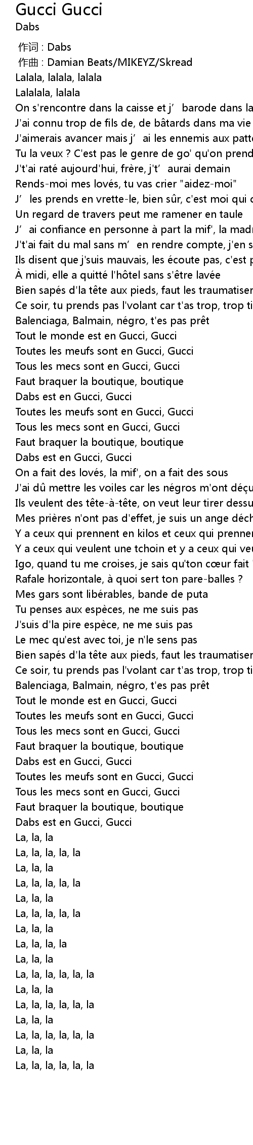 | [01:45.99] | Tout le monde est en Gucci, Gucci |