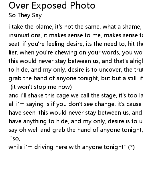 i take the blame, it's not the same, what a shame, future lessons for past insinuations, it makes sense to me, makes sense to me, i left the keys under the seat. if you're feeling desire, its the need to, hit the lights and, fuck the lier, when you're chewing on your words, you won't need to believe me. i know this would never stay between us, and that's alright cause i don't have anything to hide, and my only, desire is to uncover, the truth about me. say oh well and grab the hand of anyone tonight, but but a still life photo, overexposed with the footnote hanging on the wall won't stop me now. [x2] (it won't stop me now) and i'll shake this cage we call the stage, it's too late to be playing games, all i'm saying is if you don't see change, it's cause you haven't seen what i have seen. this would never stay between us, and that's alright cause i don't have anything to hide, and my only, desire is to uncover, the truth about me. say oh well and grab the hand of anyone tonight, but but a still life photo, overexposed with the footnote hanging on the wall won't stop me now. [x4] "so, while i'm driving here with anyone tonight" (?)