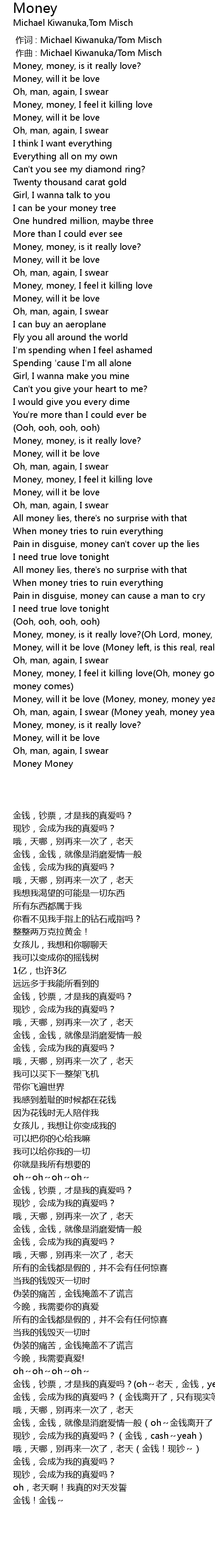 | [03:51.70] | 金钱,钞票,才是我的真爱吗?(oh~老天,金钱,yeah,金钱也能够撒谎) |