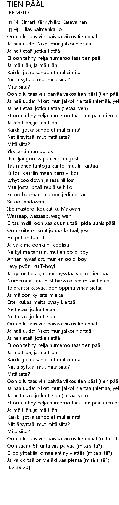 | [00:20.61] | Oon ollu taas viis päivää viikos tien pääl (tien pääl, yeh) |