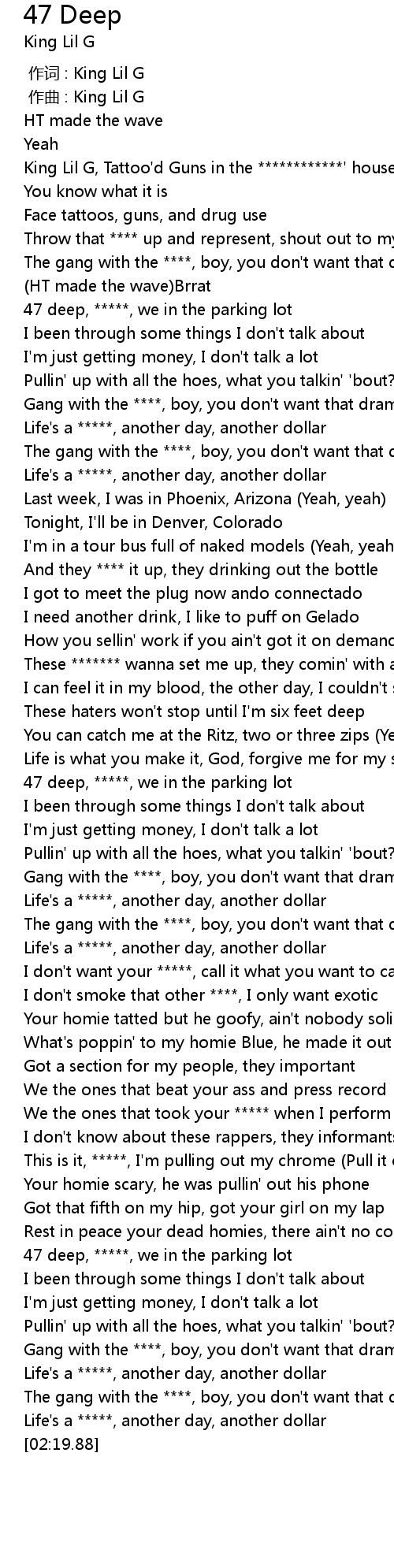 | [01:59.94] | 47 deep, *****, we in the parking lot |
