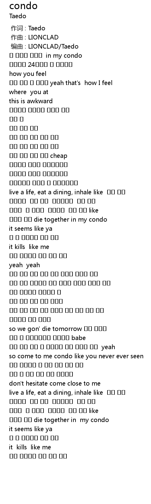 | [01:05.33] | 살던지 아님 die together in my condo |
