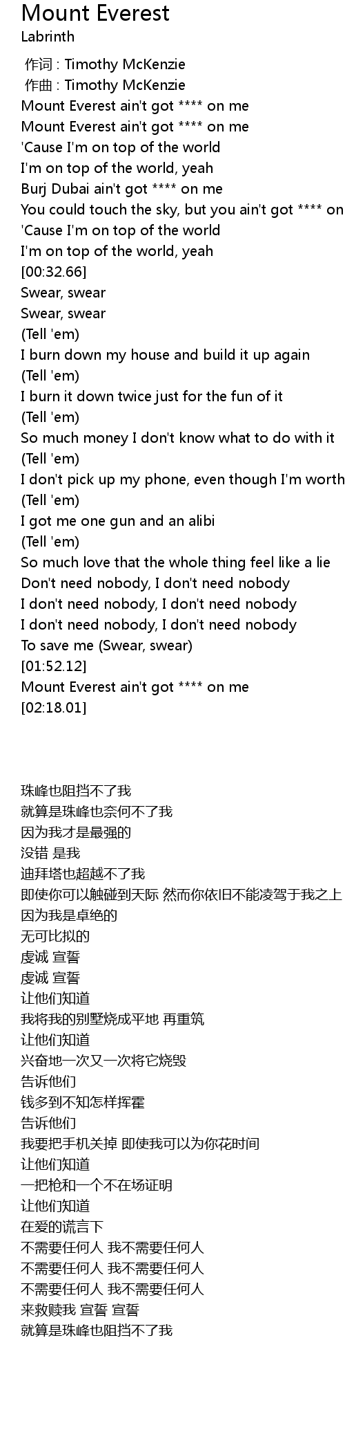 | [02:13.66] | Mount Everest ain't got **** on me |