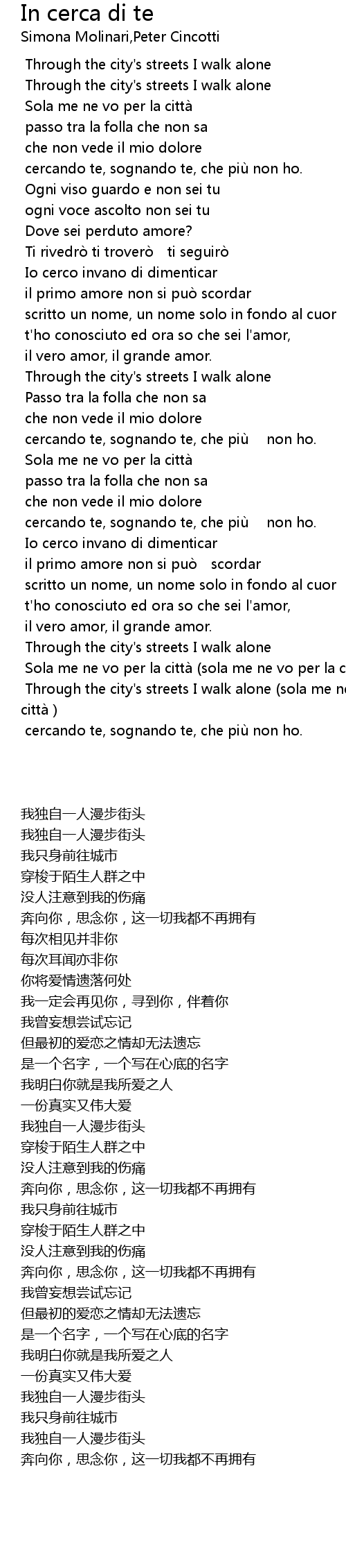 | [02:36.080] | Through the city's streets I walk alone (sola me ne vo per la città) |