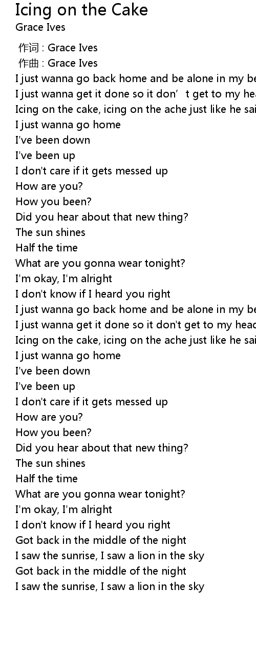 | [00:56.77] | Icing on the cake, icing on the ache just like he said |