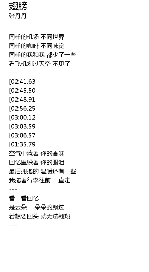 | [03:29.70][02:41.63][01:05.24] | 用你给我的翅膀飞 |