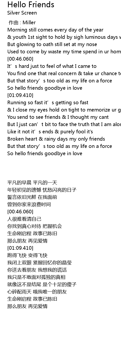 | [02:00.250] | So hello friends goodbye in love |