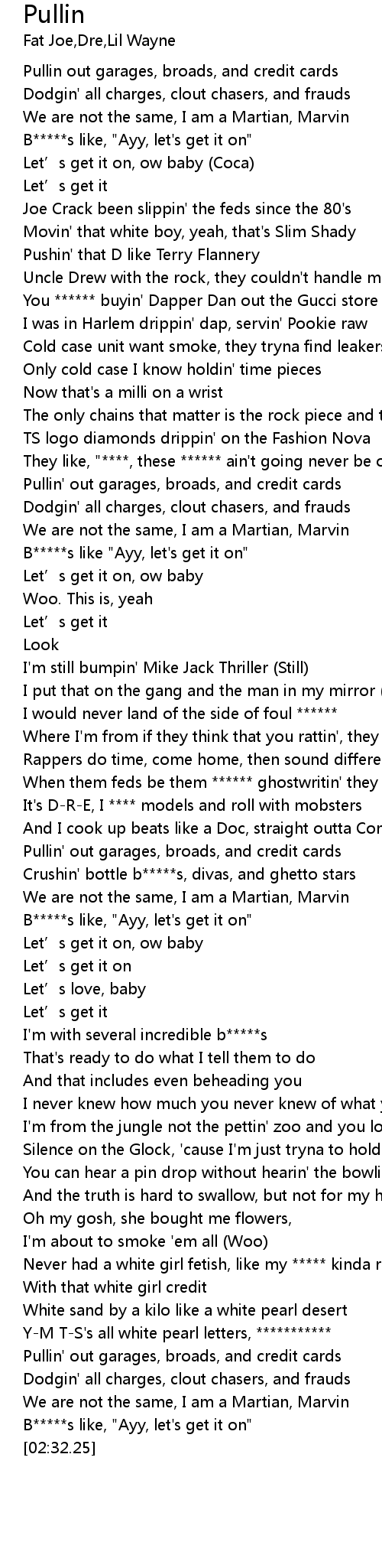 | [01:27.08] | Pullin' out garages, broads, and credit cards |