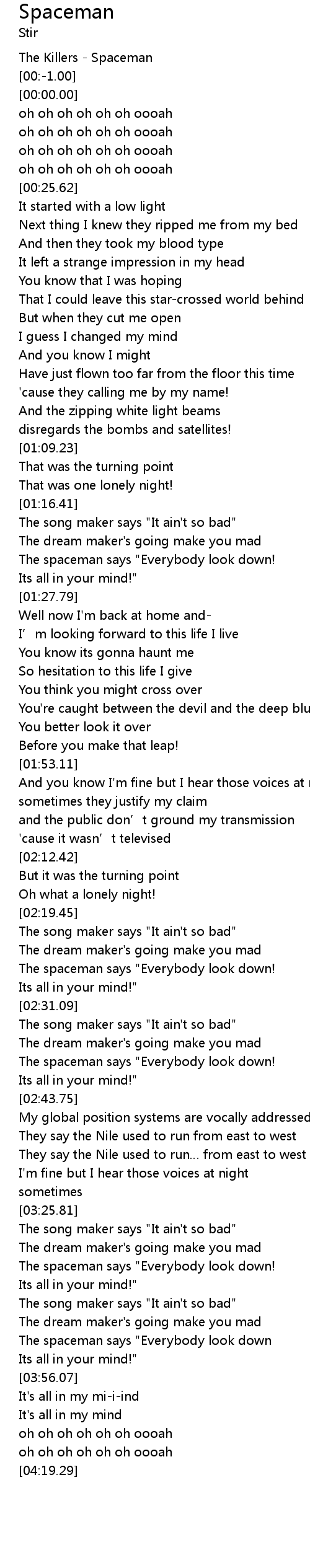 | [03:48.21] | The spaceman says " Everybody look down |