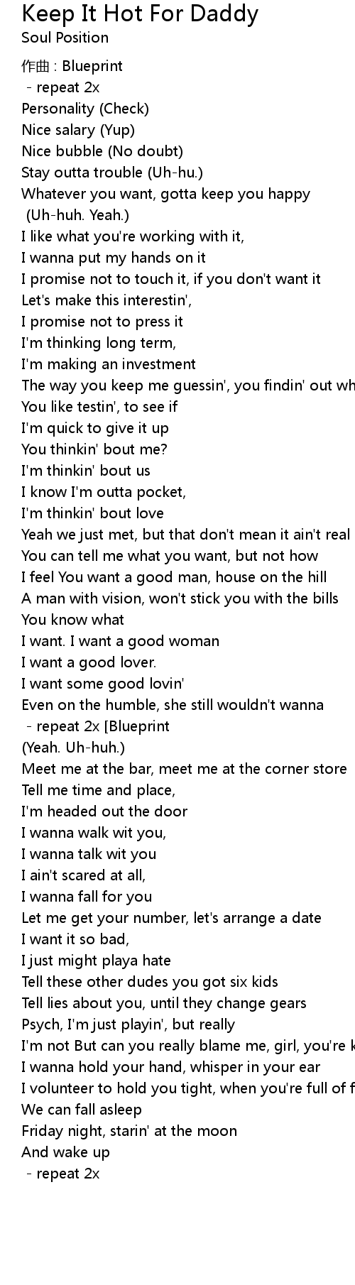| Keep it hot for daddy, even if it ain' t summer Hook repeat 2x Blueprint Yeah. Uhhuh. | |