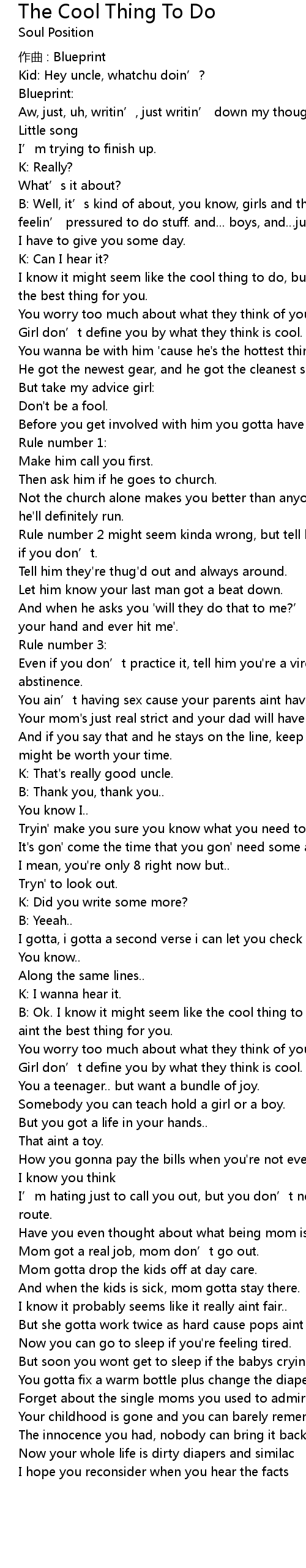 | B: Well, it' s kind of about, you know, girls and they grow up, and how they be feelin' pressured to do stuff. and... boys, and just advice | |