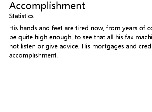 | His hands and feet are tired now, from years of corporate climb. He will never be quite high enough, to see that all his fax machines will tell him things, but not listen or give advice. His mortgages and credit cards cards do not measure accomplishment. |