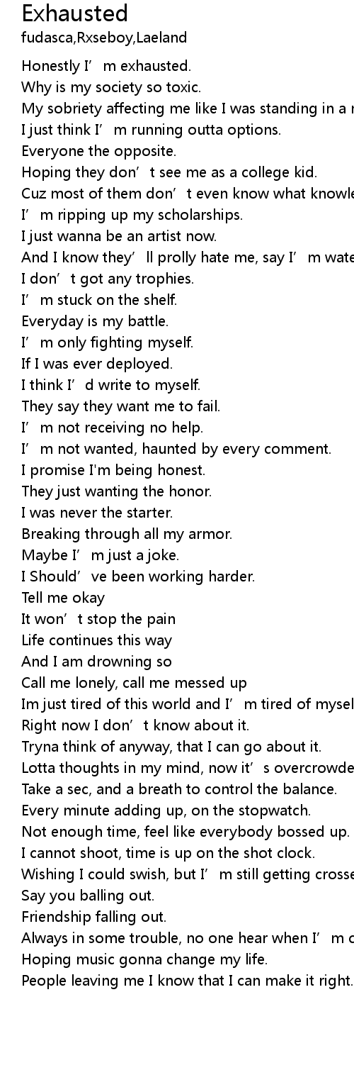 | [00:11.91] | Honestly I' m exhausted. |