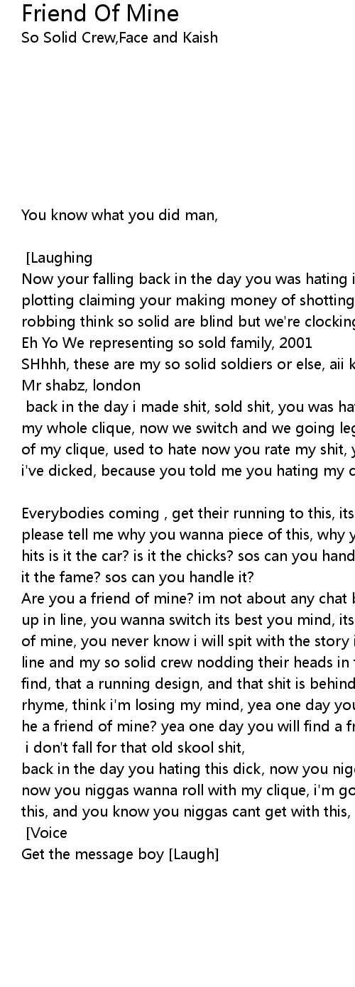 Are you a friend of mine? im not about any chat behind, you grown ups stepping up in line, you wanna switch its best you mind, its the last damn time, a friend of mine, you never know i will spit with the story interhyme, with a deep base line and my so solid crew nodding their heads in time, if you think you will find, that a running design, and that shit is behind, because i'm spitting my rhyme, think i'm losing my mind, yea one day you will find a friend of mine, is he a friend of mine? yea one day you will find a friend of mine a friend of mine is he a friend of mine? [Chorus Kaish] i don't fall for that old skool shit, back in the day you hating this dick, now you niggas wanna roll with my clique, now you niggas wanna roll with my clique, i'm gonna rip this, fit this, hit this, and you know you niggas cant get with this, we're gonna blow this, rip this, show this, what you think we cant control this? [Chorus Kaish] [Voice] |